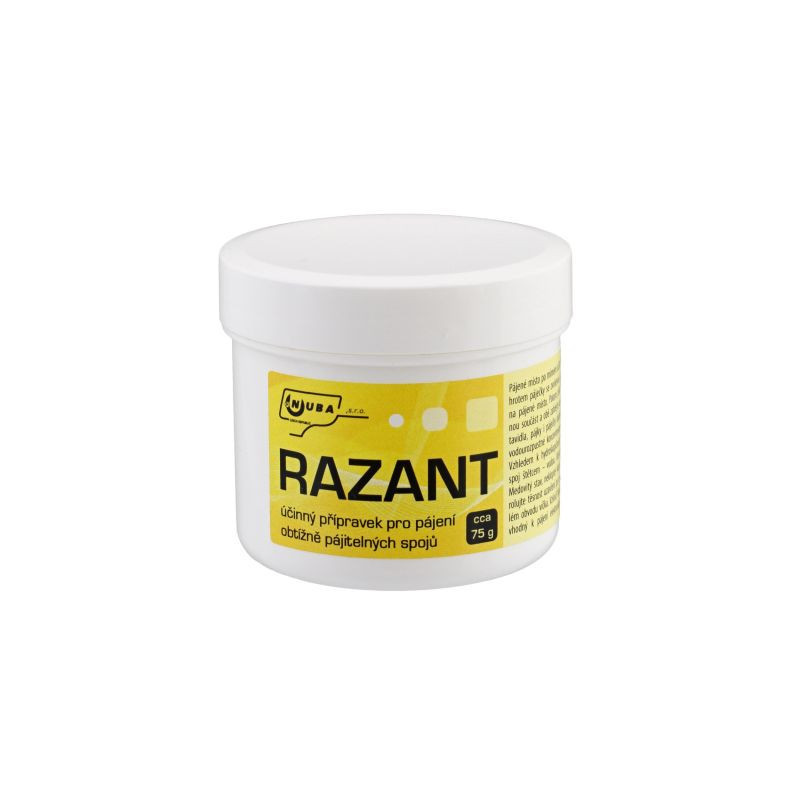 RAZANT je velmi účinný přípravek určený pro pájení obtížně pájitelných spojů. RAZANT je navíc vodou rozpustný, tudíž se jedná o ekologicky šetrný výrobek.