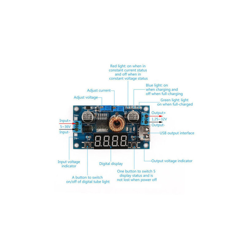Vstupní napětí 7-40V. Výstupní napětí 1,2-32V (nastavitelné). Výstupní proud 0-9A nastavitelný (9A MAX - s aktivním chlazením)