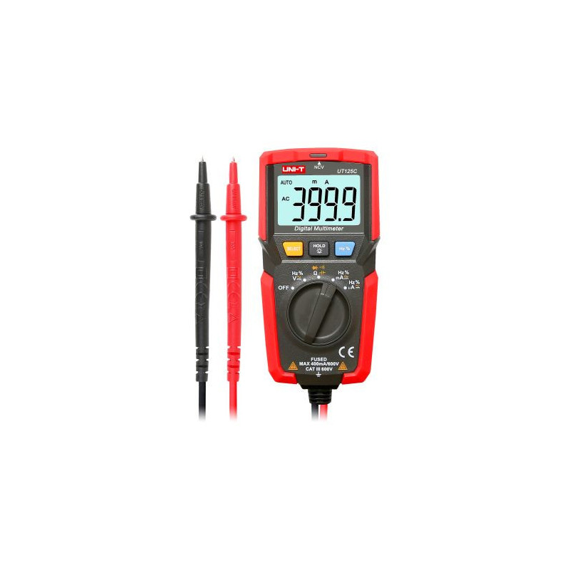 Spolehlivý kapesní multimetr s digitálním displejem, který zobrazí až 4000 číslic. Ideální nástroj pro měření stejnosměrného i střídavého napětí a proudu, odporu, kapacity a spojitosti vedení s ochranou proti přetížení. V této cenové relaci je přístroj navíc vybaven nadstandardními funkcemi, mezi které patří bezkontaktní měření napětí (NCV), měření frekvence a podsvícení displeje. UT125C vyhovuje standartu CAT III 600V a certifikátu cETLus.