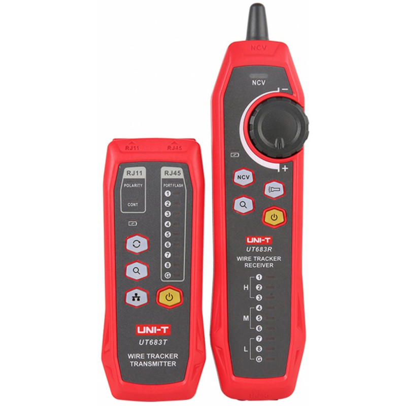Tester kabelu UT683KIT je inteligentní vyhledávač kabelů , který se skládá z vysílače a přijímače. Přijímač dokáže rychle a přesně lokalizovat cílový kabel. Tato sada dokáže automaticky identifikovat přerušený obvod, zkrat, polaritu a další stavy, které vám pomohou rychle rozlišit poruchy kabelu. Je to ideální přístroj pro integrované zapojení, instalaci a údržbu slaboproudých elektrických systémů.
